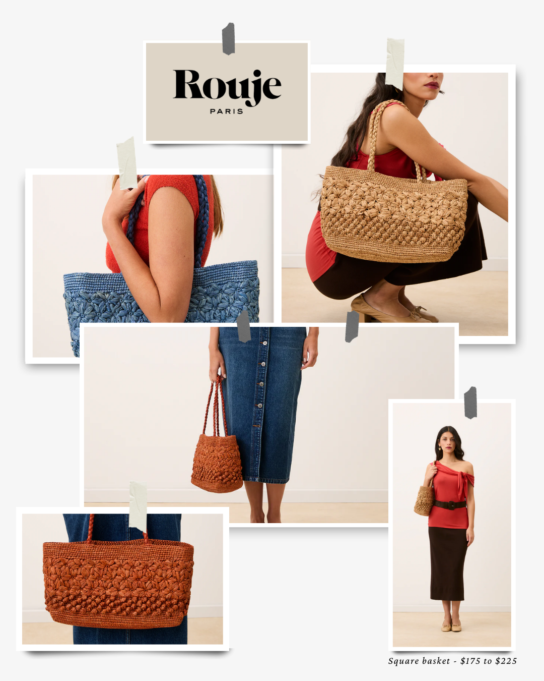 When it comes to basket bags, Rouje brings a playful yet polished take on the classic woven style. The square basket featured here stands out for its structured shape and textured weave, giving it a slightly more graphic, modern feel while still staying true to the charm of a traditional basket bag. It feels easy and wearable, yet intentional, the kind of piece that naturally elevates simple warm-weather outfits.