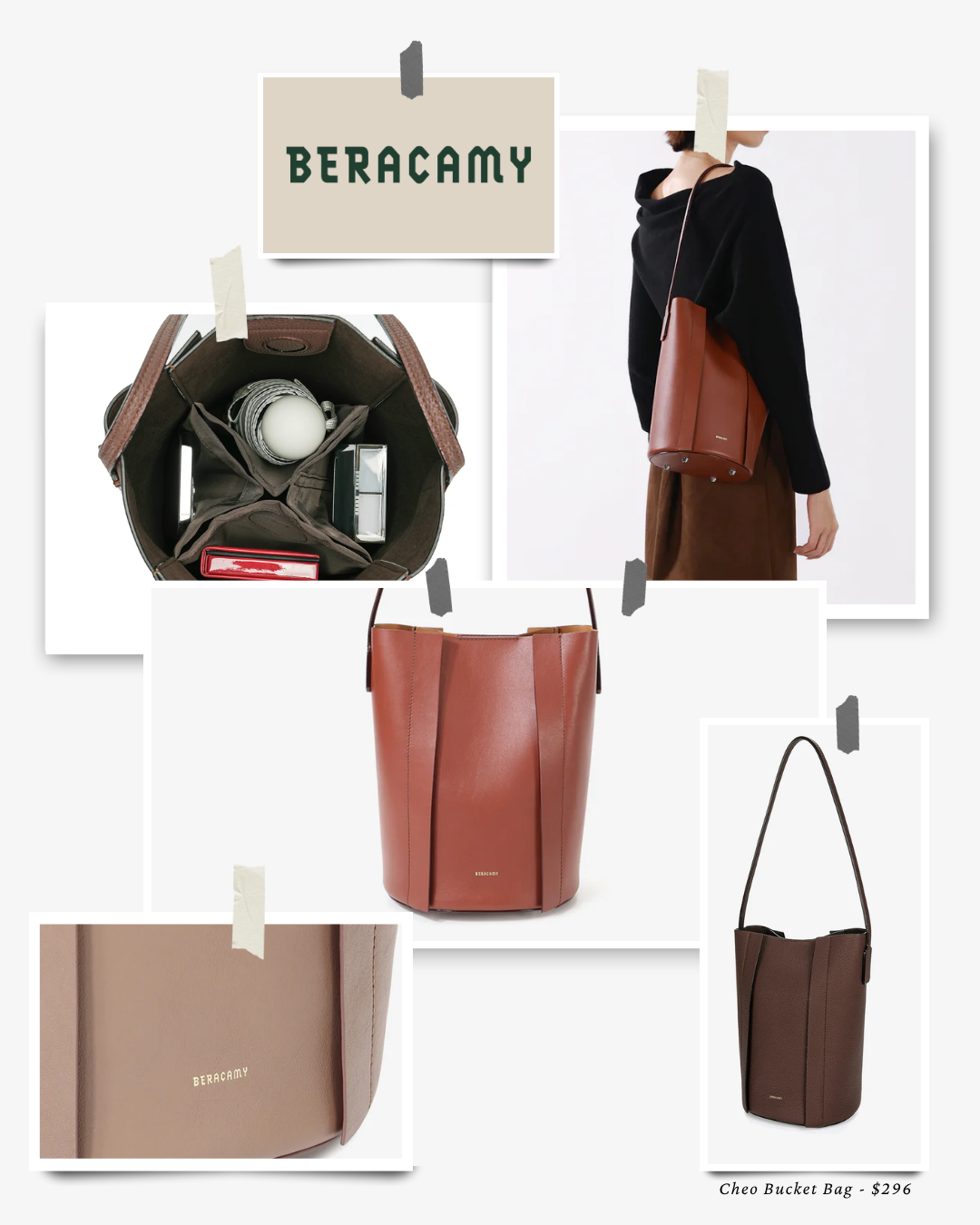 The Cheo Bucket Bag immediately stood out to me for its clean vertical silhouette and structured yet fluid shape. The interior compartments are designed to help keep everyday essentials organized, making it a practical option for daily use while still maintaining a very refined aesthetic. The shape feels modern and timeless at the same time, a piece that integrates beautifully into a minimalist wardrobe.