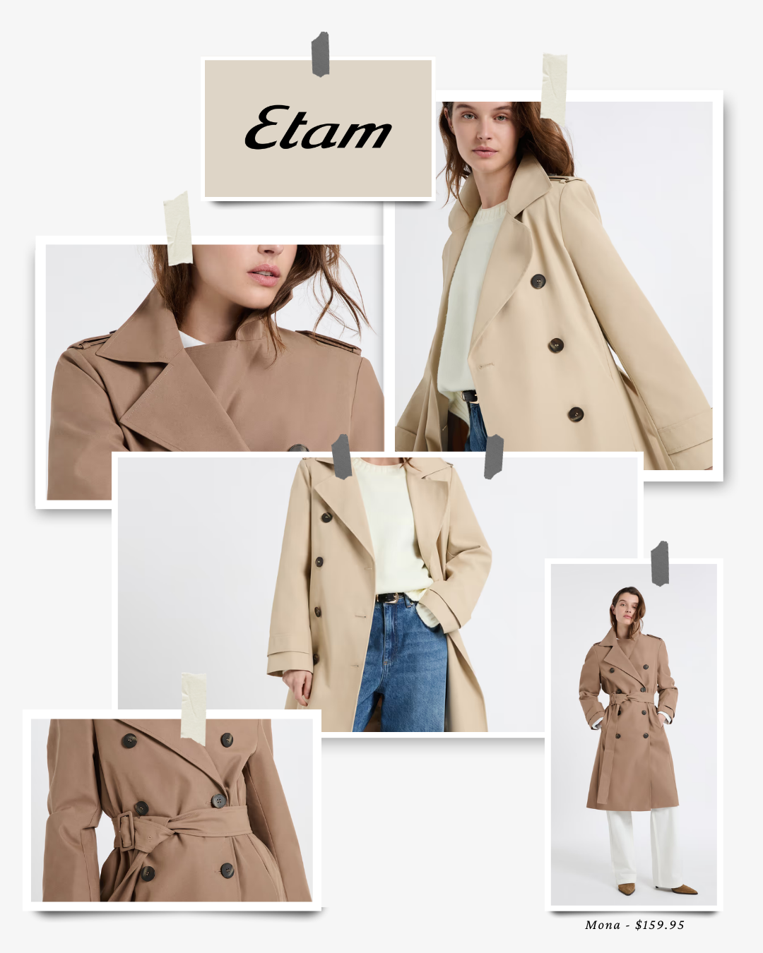 Growing up in France, Etam was a brand I shopped often, it’s familiar, reliable, and consistently easy to wear. The Mona trench, featured here, reflects that same spirit. Simple, classic, and practical, it’s a great option if you’re looking for a trench that works effortlessly for everyday wear without a high price tag.