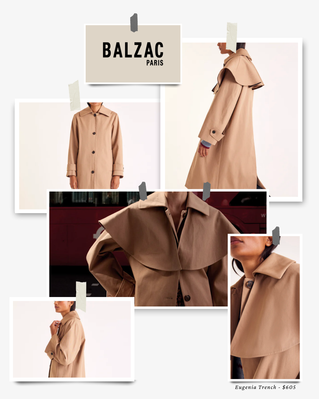 The Eugenia trench, featured here, reflects Balzac’s refined yet modern approach to outerwear. With its structured shape, elegant details, and classic neutral tone, it feels polished without being rigid. I especially love the removable panel, which gives the coat two distinct looks, allowing you to switch between a more classic silhouette and a slightly more statement feel. It’s a great option if you’re looking for something a bit more distinctive while still feeling timeless.