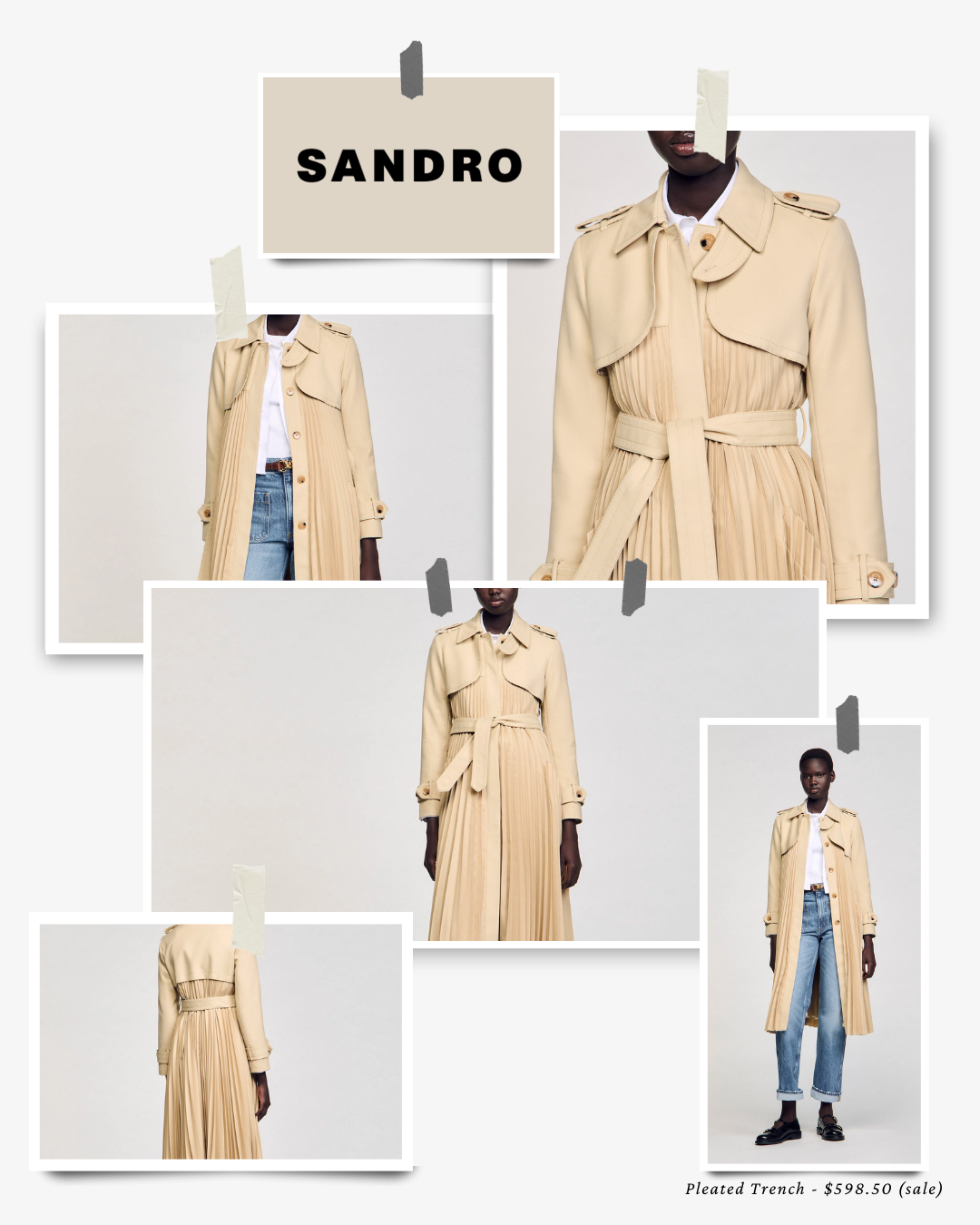 The pleated trench, featured here, offers a fun twist on the classic silhouette. The pleating adds movement and softness, giving the coat a more fashion-forward feel while remaining timeless and wearable. It’s on the pricier side, though currently on sale, and a great option if you’re looking for something distinctive that still feels grounded in classic French tailoring. I own several Sandro pieces and can confidently say the quality is exceptional, especially when it comes to outerwear designed to last for years. If you’re working with a higher budget, their more classic styles, like the belted double-breasted trench, are also worth exploring as long-term investments.