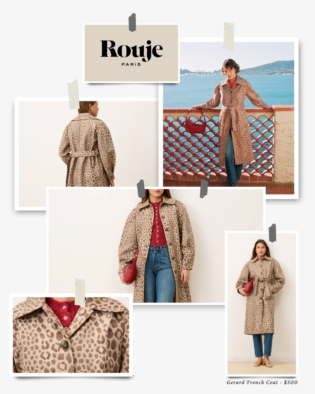 The Ezra trench, featured here, brings that signature Rouje sensibility to classic outerwear. With its softly structured shape, fluid drape, and thoughtful details, it feels feminine without being precious and polished without feeling stiff. If you’re drawn to a more playful interpretation of the trench, Rouje’s leopard print Gérard trench offers a bolder alternative, which we explore a bit further down in the edit.