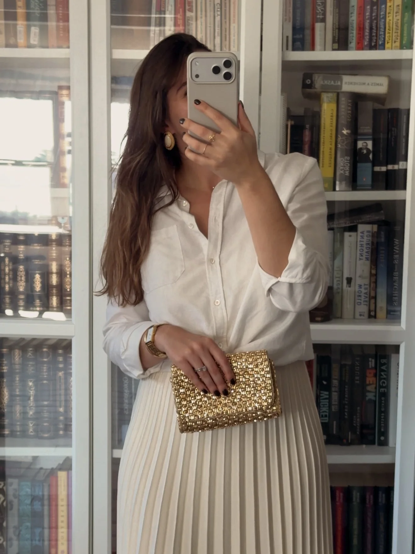 A streamlined skirt, pointed heels, or a structured clutch can instantly elevate sequins, velvet, or knits by adding quiet sophistication. These elements create length, polish, and intention without overwhelming the outfit!