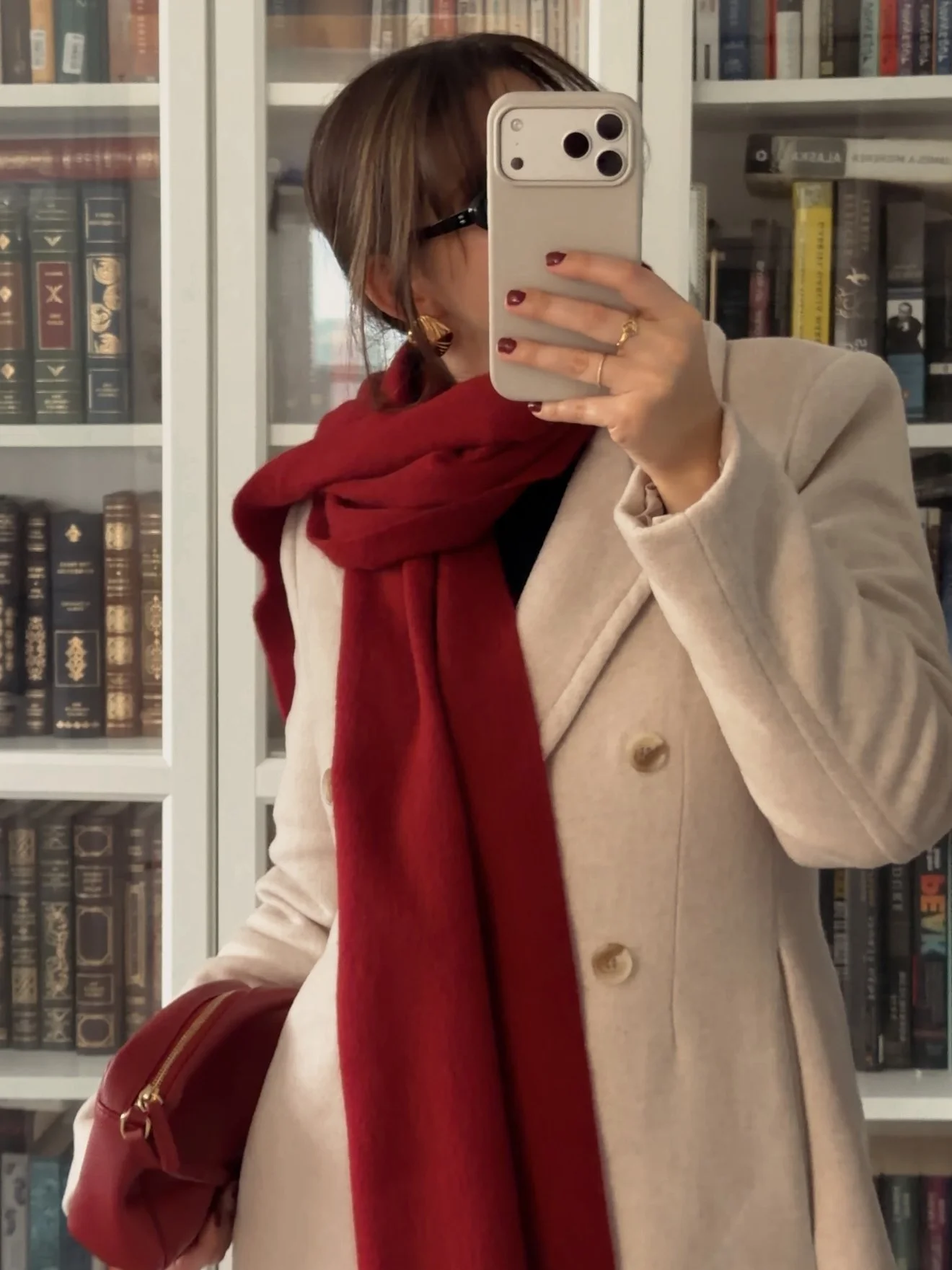Red is one of those colors that instantly feels right during the holidays. It adds warmth and confidence, even when the rest of your outfit is simple. A scarf thrown on as you’re heading out the door, a red lip just before you leave the house, a bag you reach for again and again. One small touch is often enough to change the entire feel of a look.