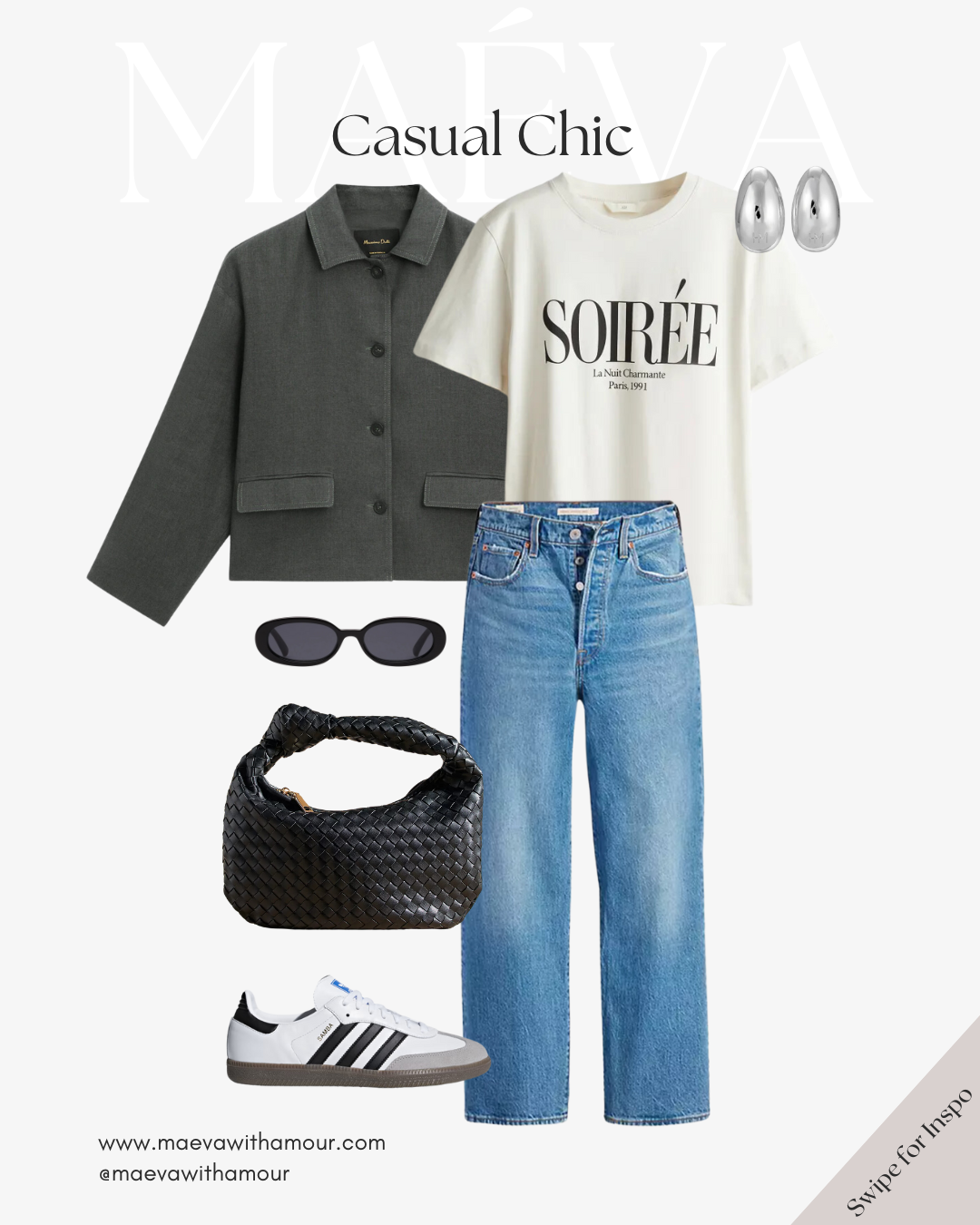 The magic of this 'Casual Chic' look is its adaptability. Each item is a soloist capable of a solo, yet together, they create a harmonious symphony. Imagine the white tee loosely tucked into the jeans, the jacket casually open, the accessories just so — and voilà, you have a look that's ready for a leisurely afternoon at Luxembourg Gardens or a spontaneous evening along the Seine.