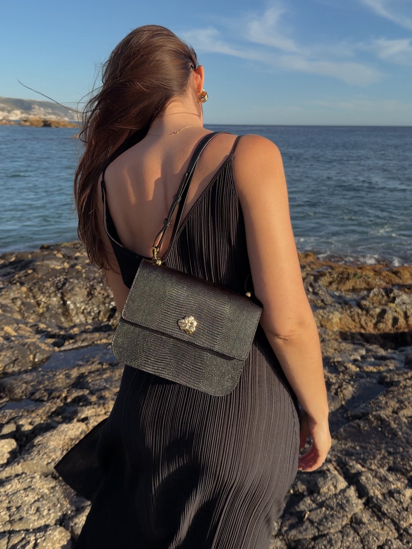 Crafted in France from lizard-embossed mineral-tanned cowhide leather, the silhouette feels elegant and structured while remaining easy to wear throughout the day. The proportions are compact yet practical, allowing it to comfortably hold everyday essentials without feeling bulky.