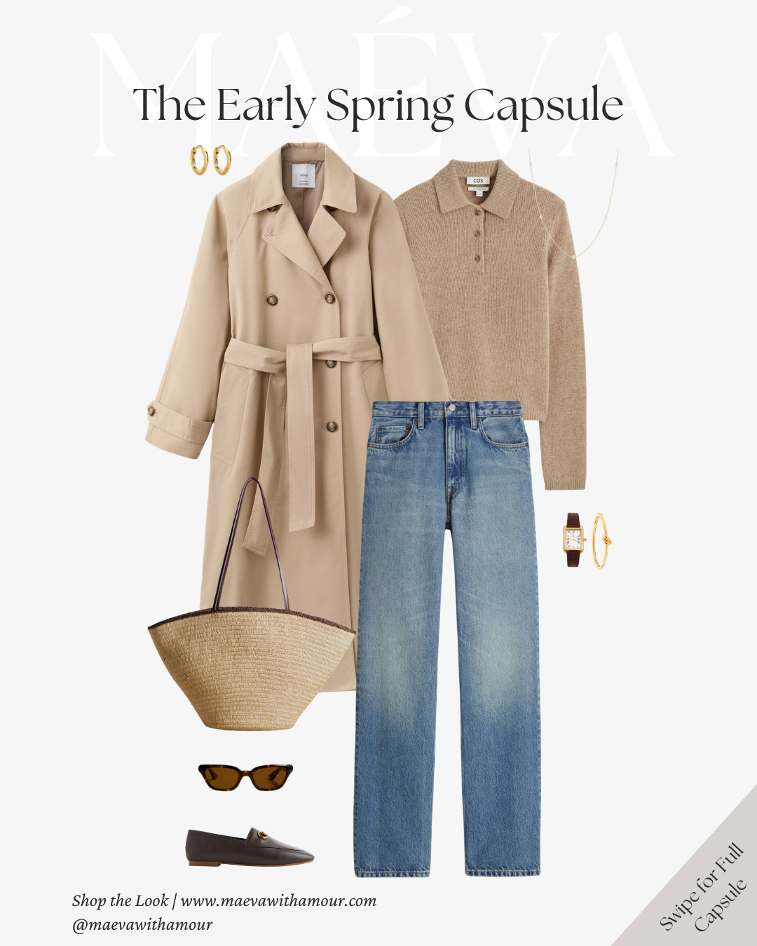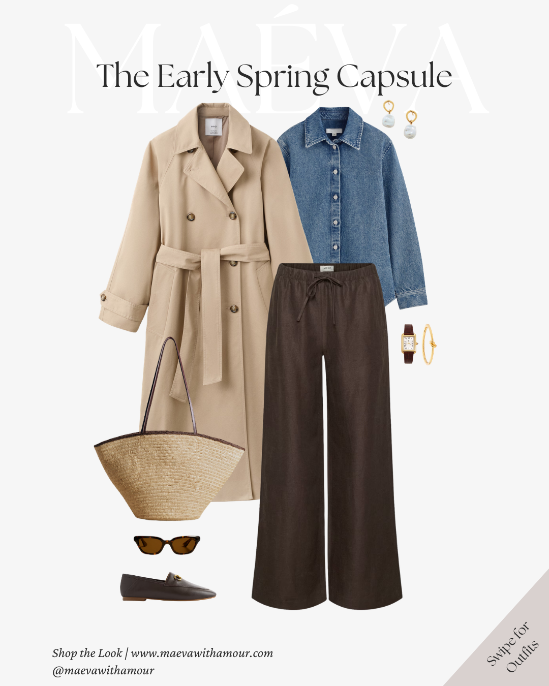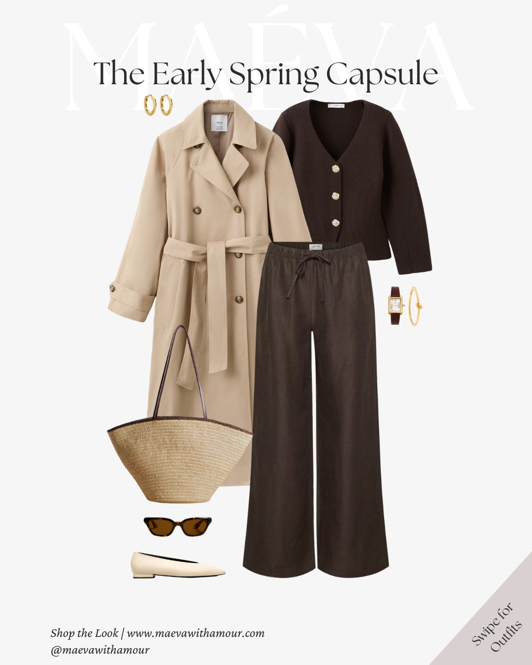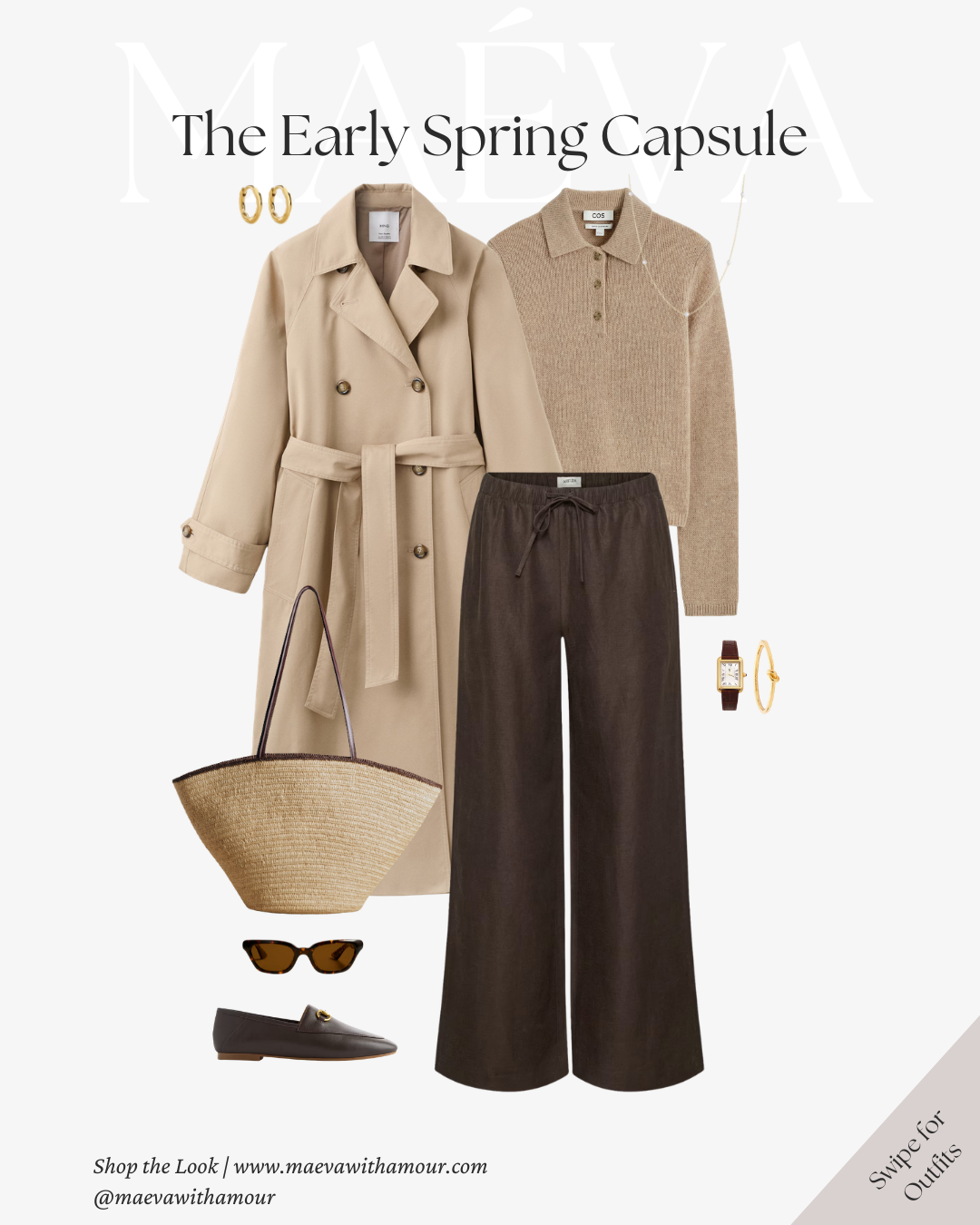 The same neutral-toned sweater styled with brown trousers creates a warmer, more grounded version of the look. Finished with loafers, a woven tote, and the trench layered on top, it feels effortless and timeless.