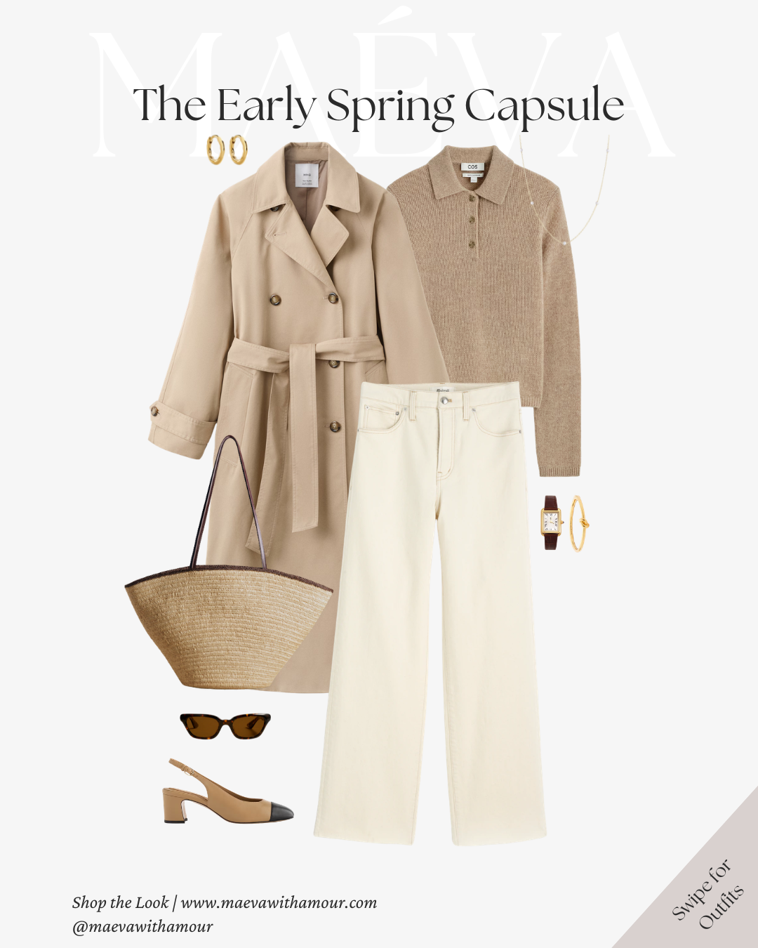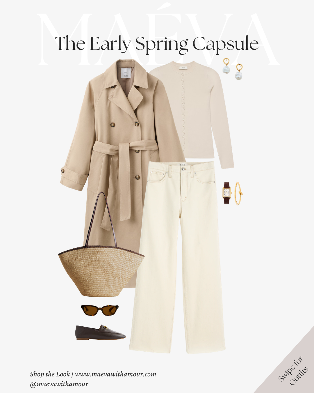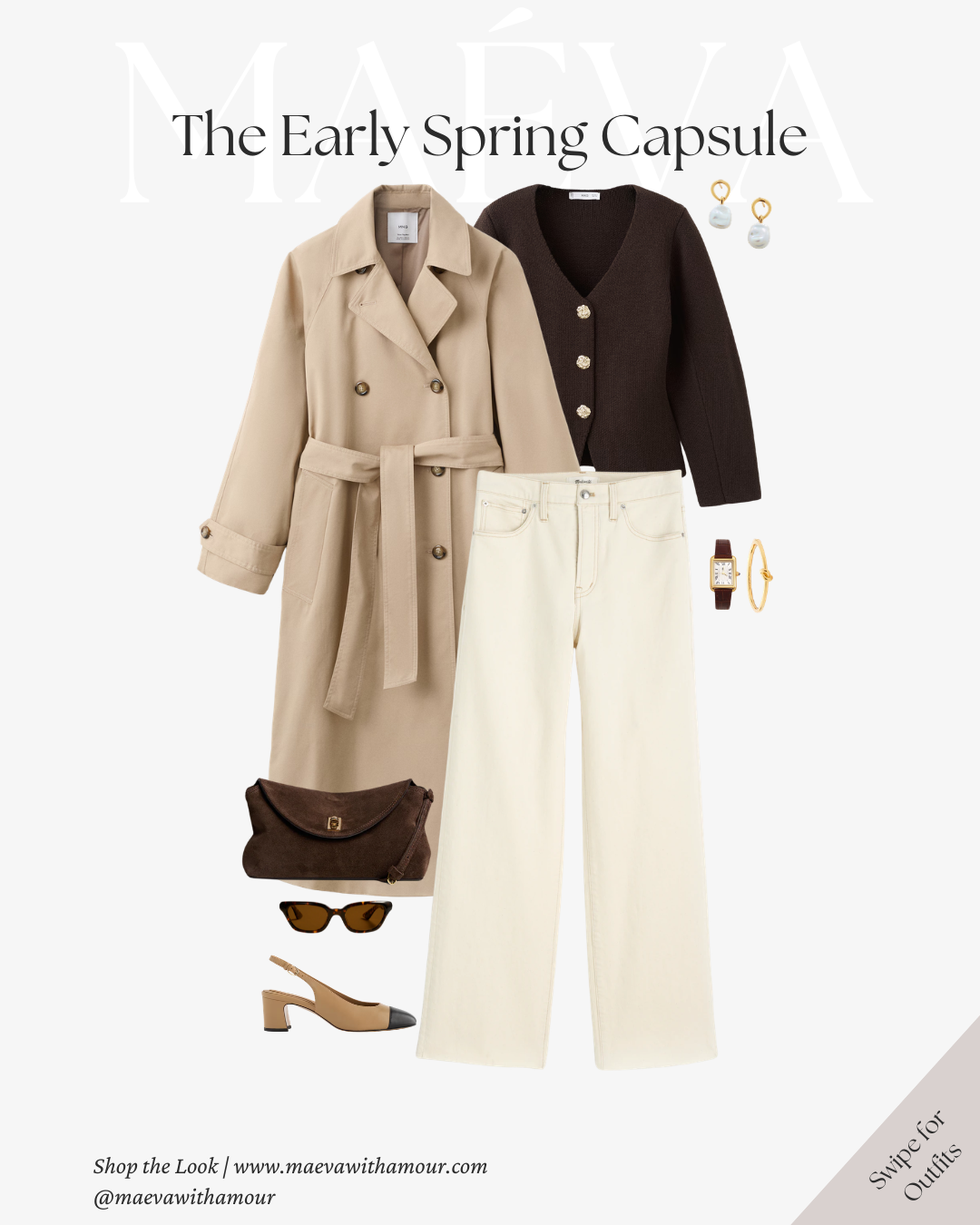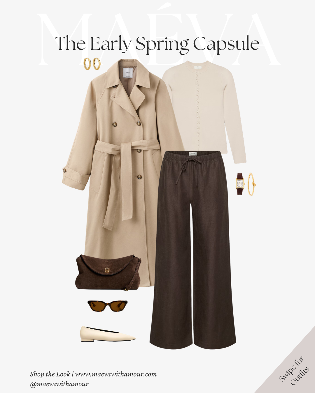 The same neutral-toned sweater styled with brown trousers creates a warmer, more grounded version of the look. Finished with loafers, a woven tote, and the trench layered on top, it feels effortless and timeless.