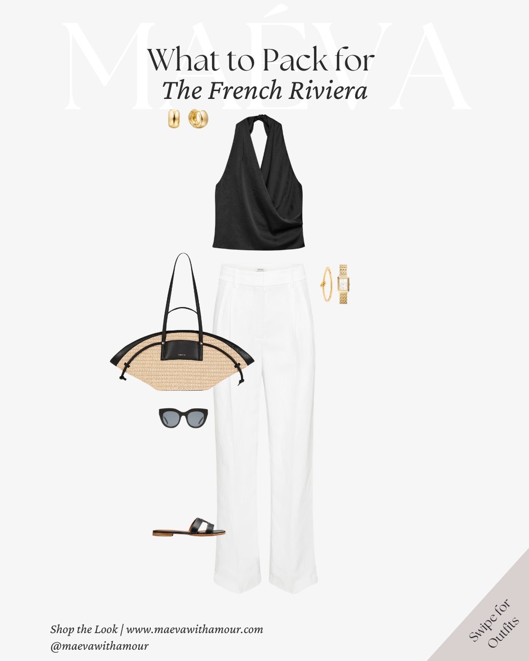 Why It Works: Combining a fluid top with structured trousers creates a balanced silhouette that feels both effortless and elevated. The black and white palette keeps the look timeless, while woven textures bring in a subtle Riviera feel.