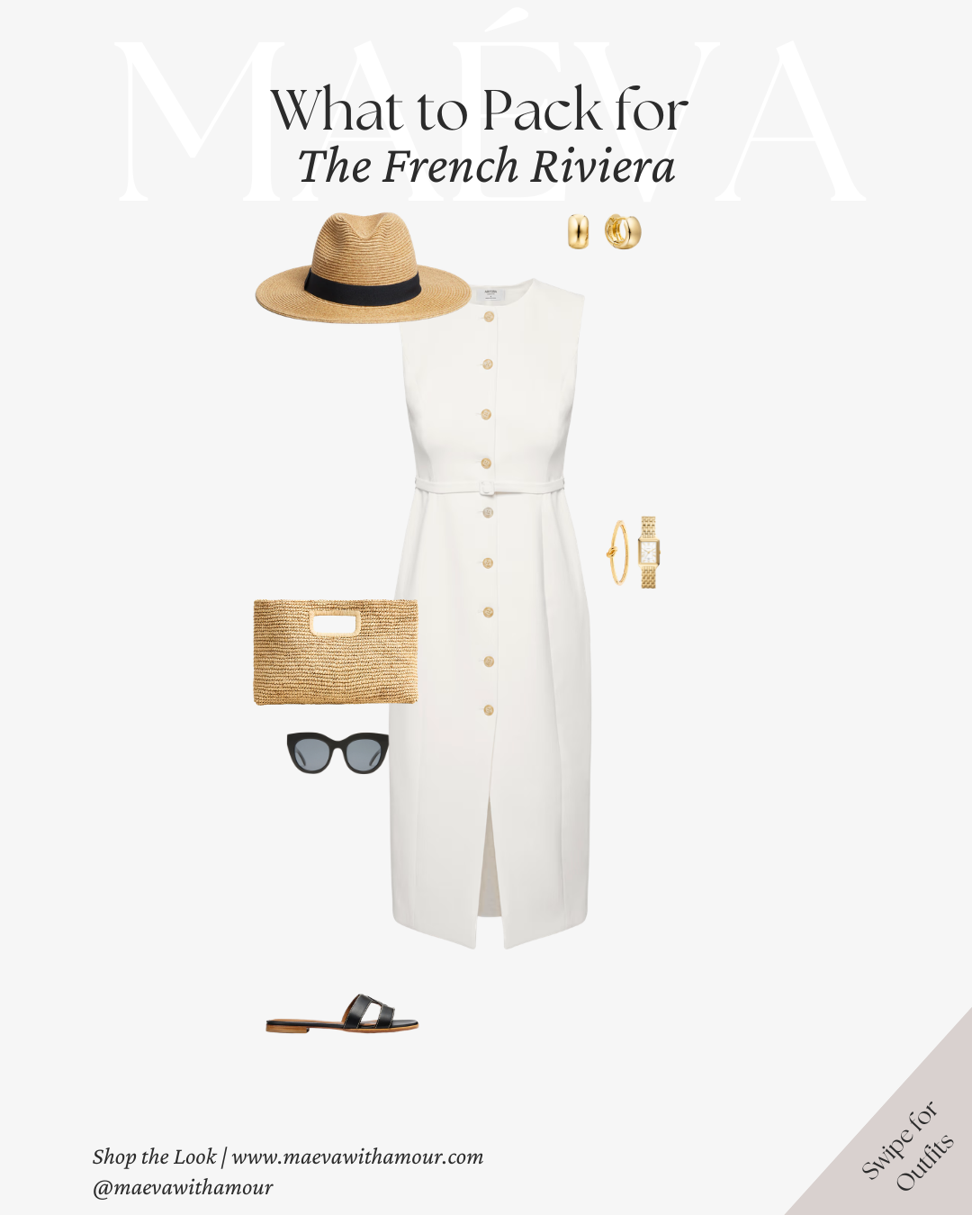 A structured cream button-front dress creates a timeless, refined look that feels perfectly suited for warm days along the French Riviera. Styled with a woven clutch, a classic sun hat, minimal gold jewelry, and simple leather sandals, the outfit feels polished, effortless, and easy to wear.