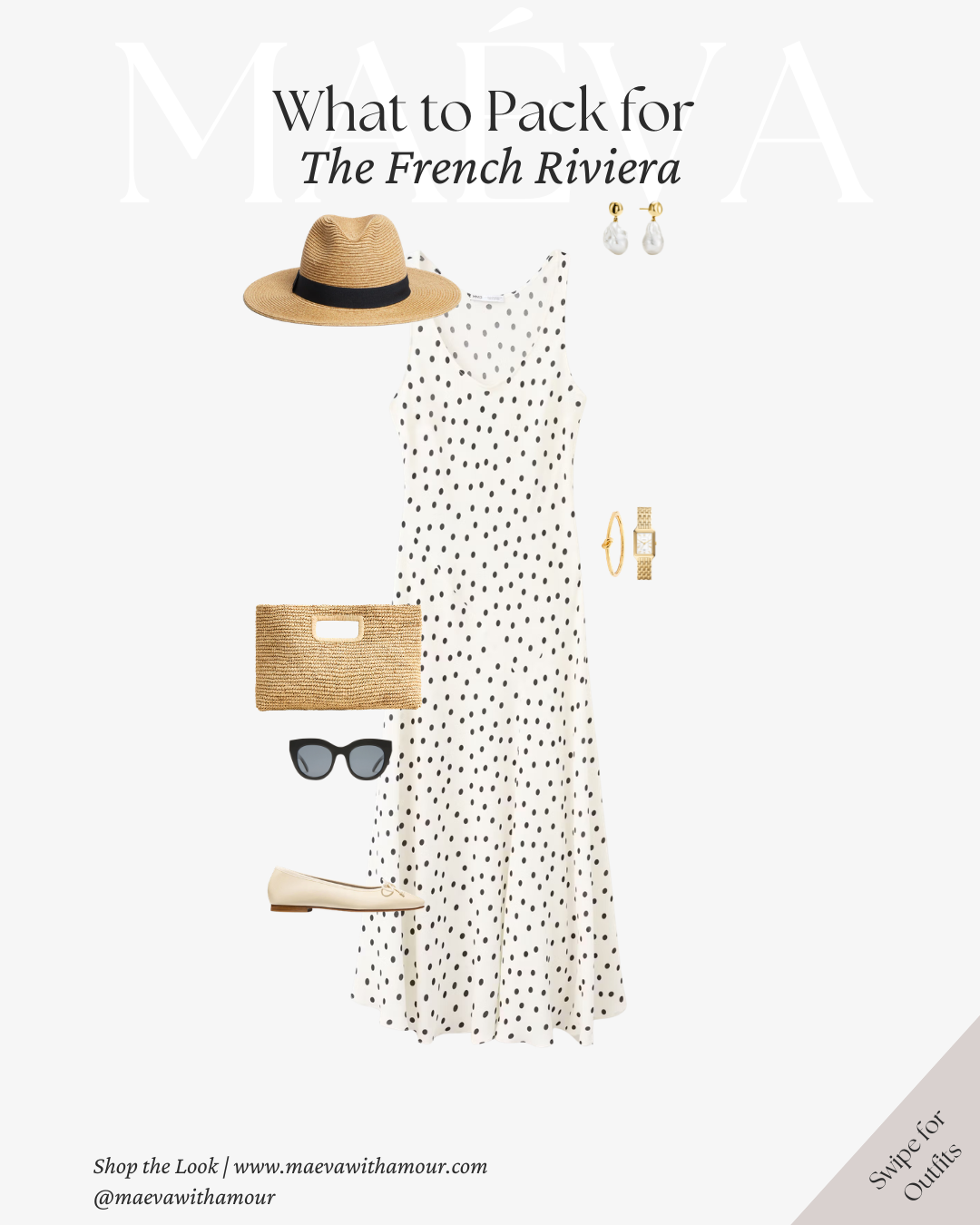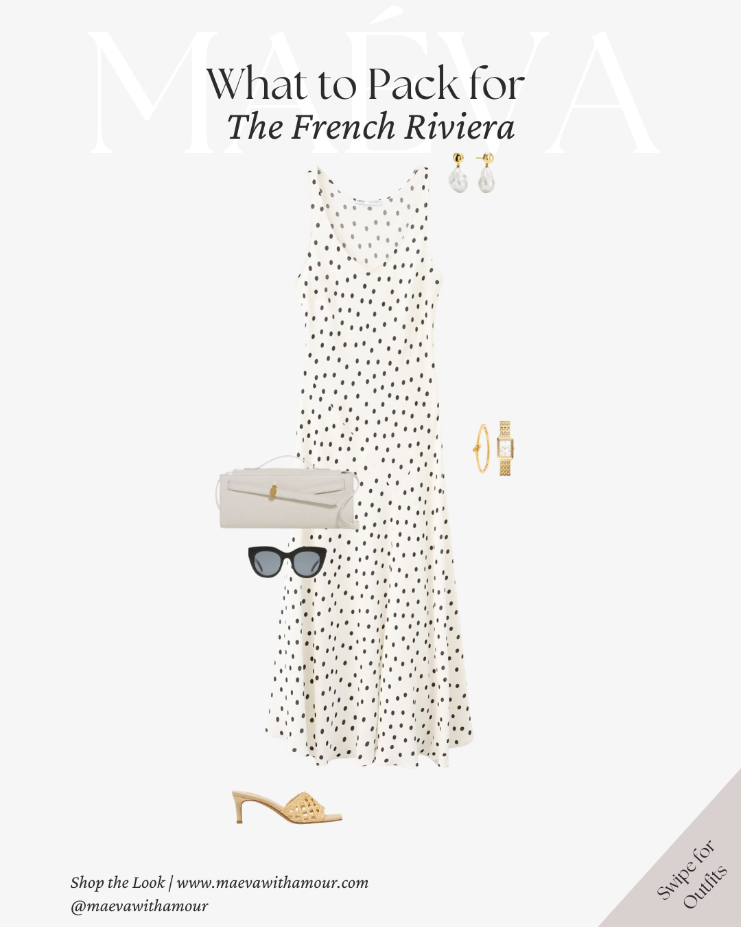 The polka dot midi dress styled for evening creates a refined, feminine look that feels effortlessly elegant along the French Riviera. Paired with a structured clutch, a woven heeled sandal, and delicate gold jewelry, the outfit feels elevated while still maintaining a sense of ease.