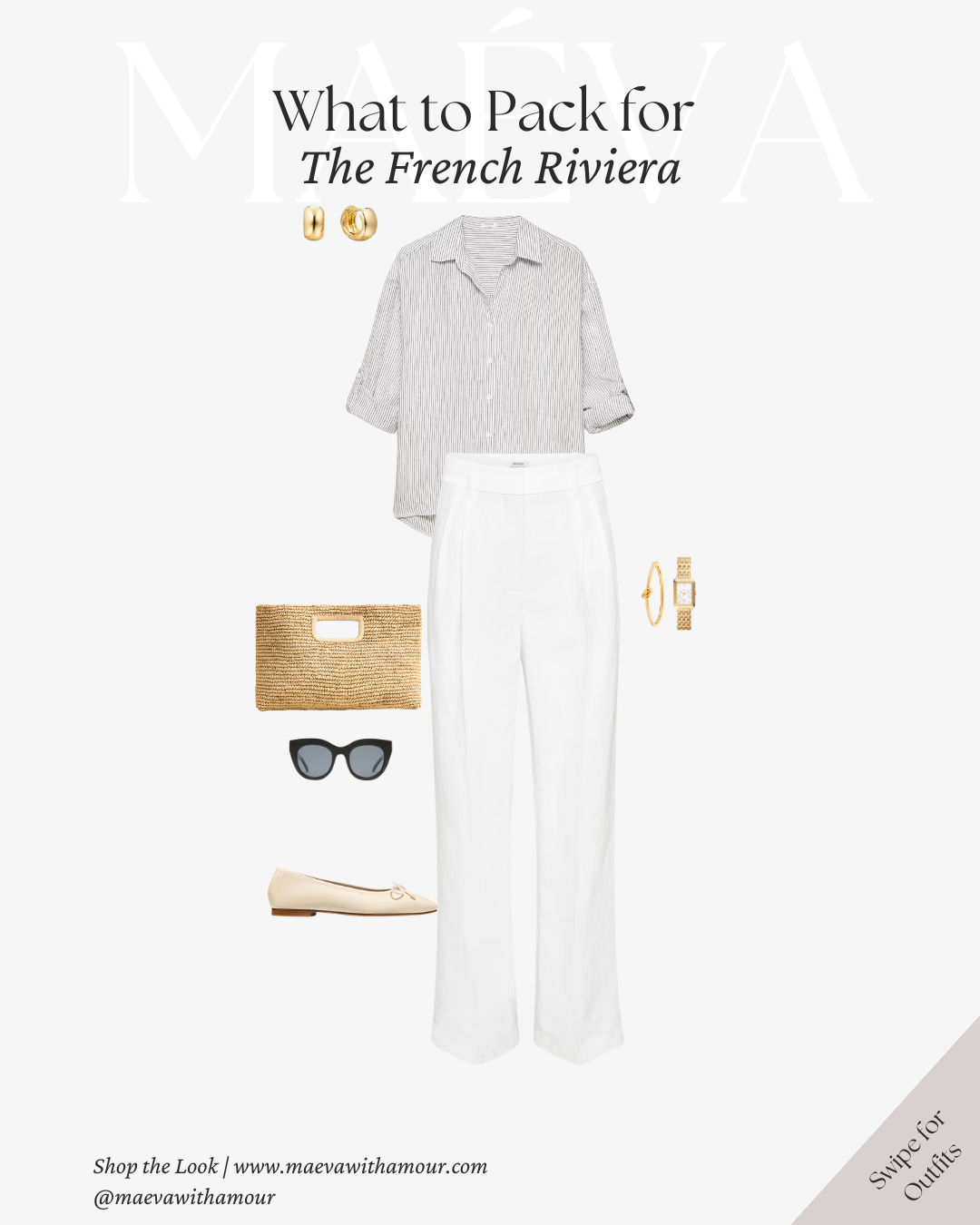Pairing a lightweight striped button-down with tailored white trousers creates an effortless, refined look that feels just right for warm days along the French Riviera. Styled with woven textures, soft gold jewelry, and classic ballet flats, the outfit feels polished yet relaxed.