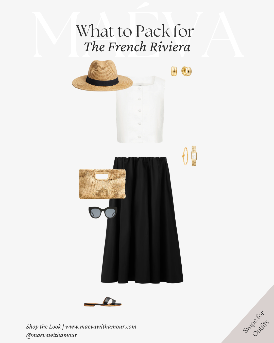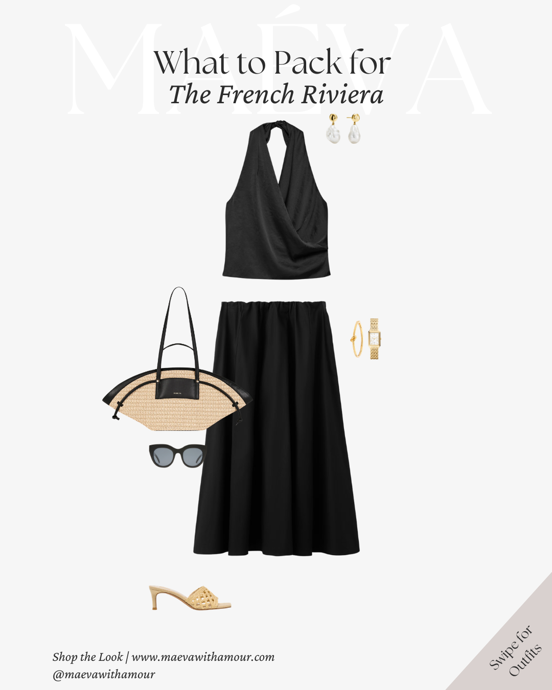 A draped black top paired with a flowing midi skirt creates a refined, monochromatic look that feels effortlessly elegant for evenings along the French Riviera. Styled with a woven heeled sandal, a structured basket, and soft gold jewelry, the outfit feels polished and intentional while still maintaining a sense of ease.