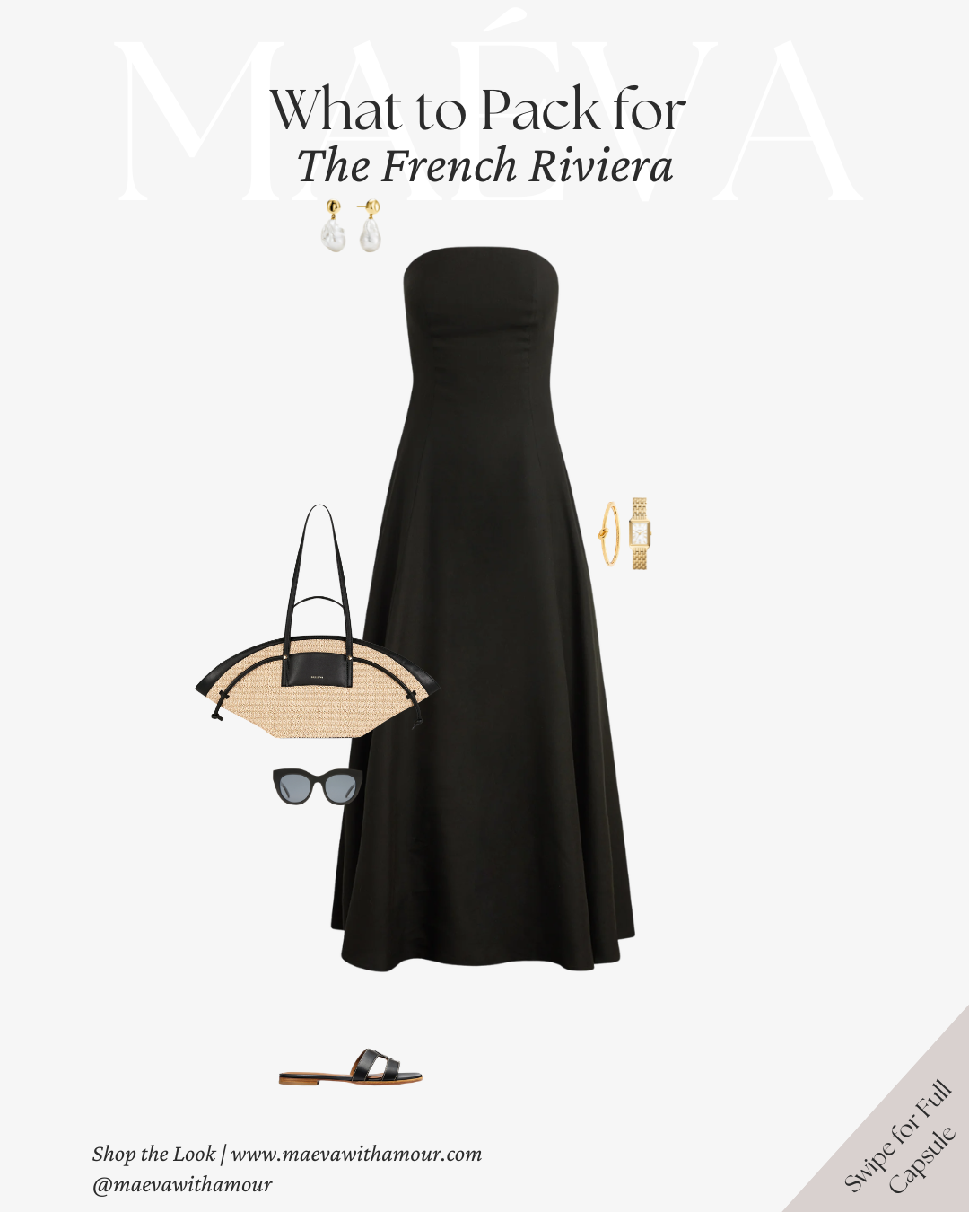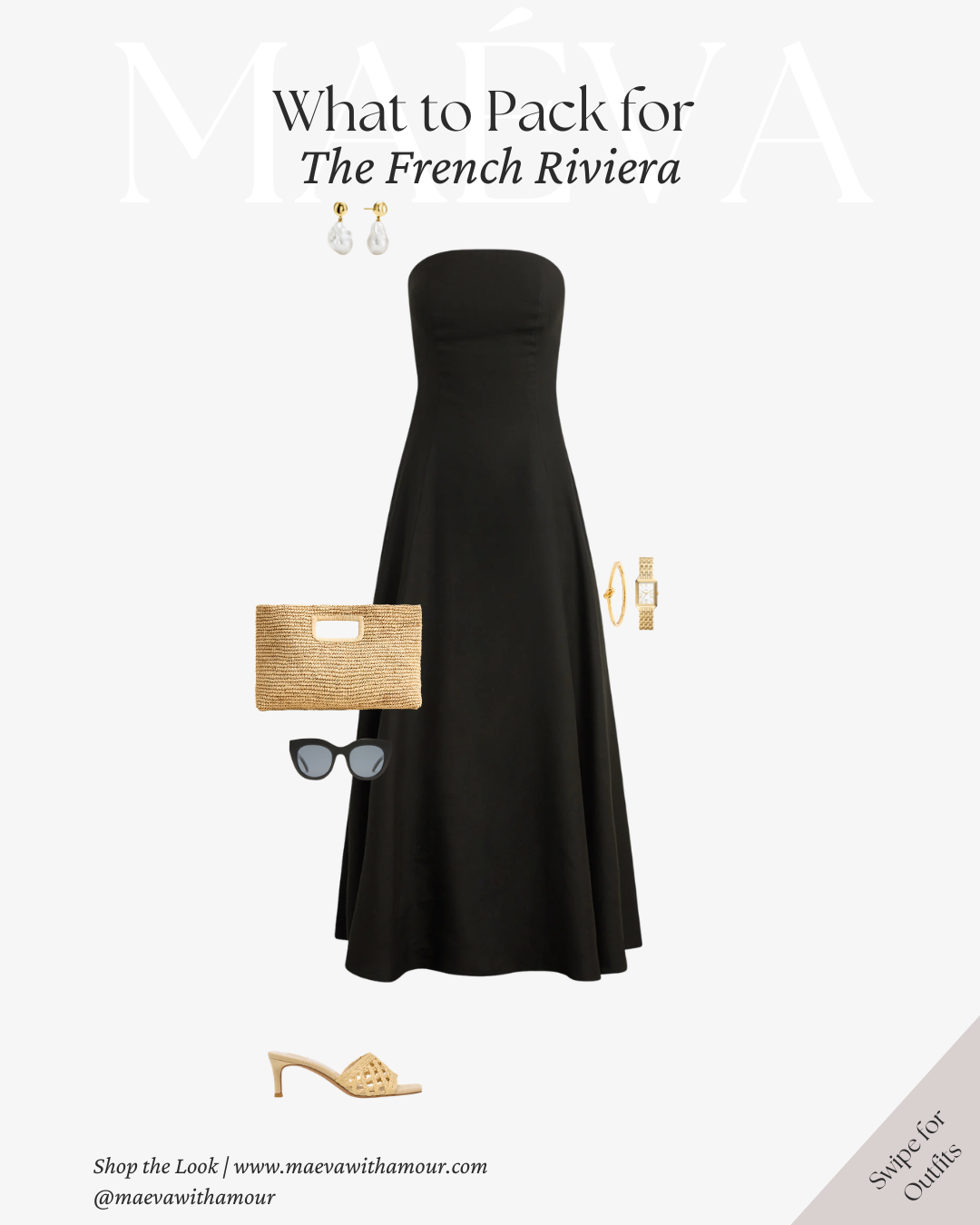 A sleek black strapless dress creates a timeless, elevated silhouette that feels perfect for evenings along the French Riviera. Paired with a sculptural woven basket, delicate gold jewelry, and simple leather sandals, the look feels refined yet relaxed, ideal for warm nights by the sea.