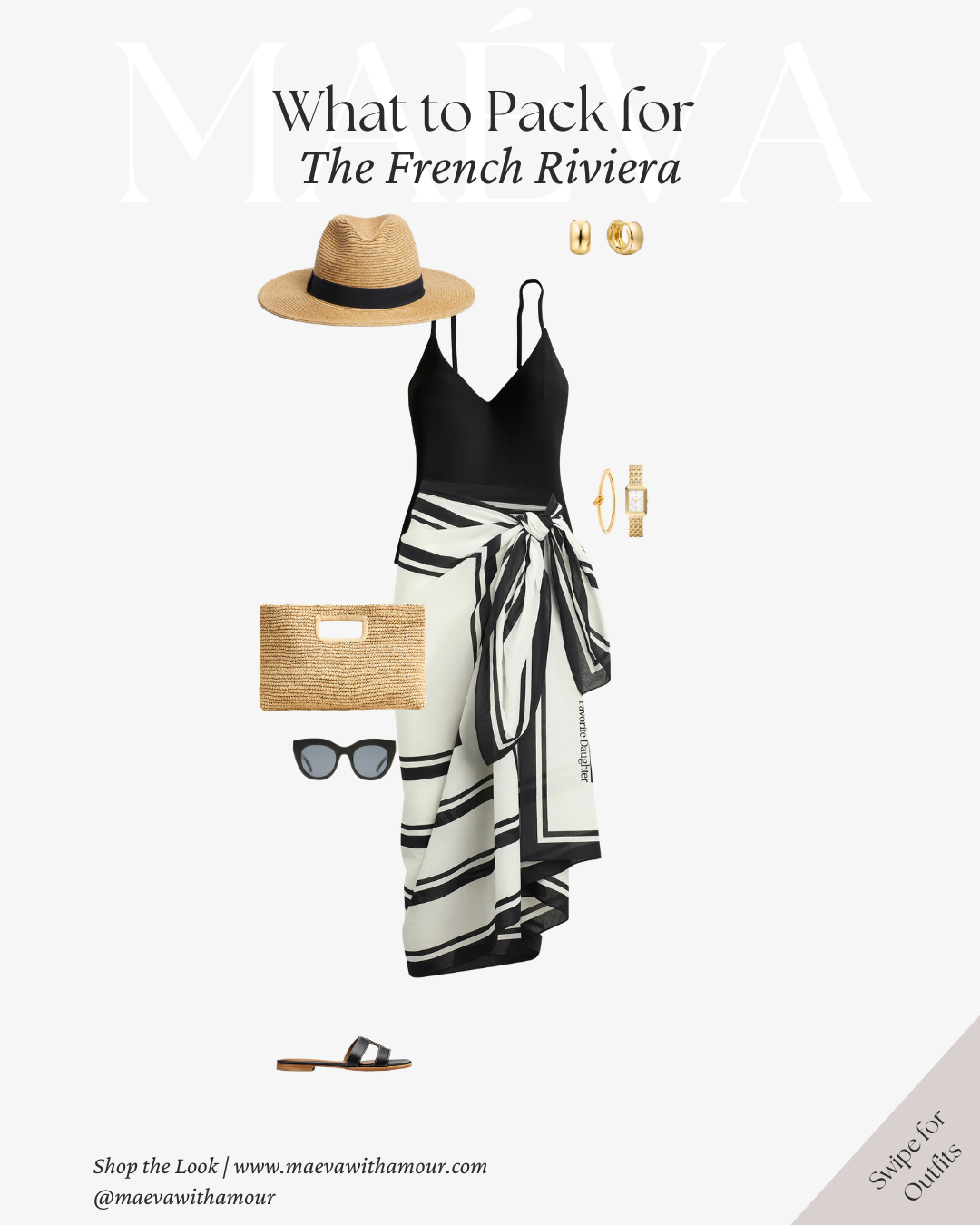 A sleek black one-piece paired with a printed pareo creates an effortless, elevated beach look that feels perfectly suited for warm days along the French Riviera. Styled with a woven clutch, a classic sun hat, and minimal gold jewelry, the outfit feels relaxed, refined, and easy to wear from the beach to lunch.