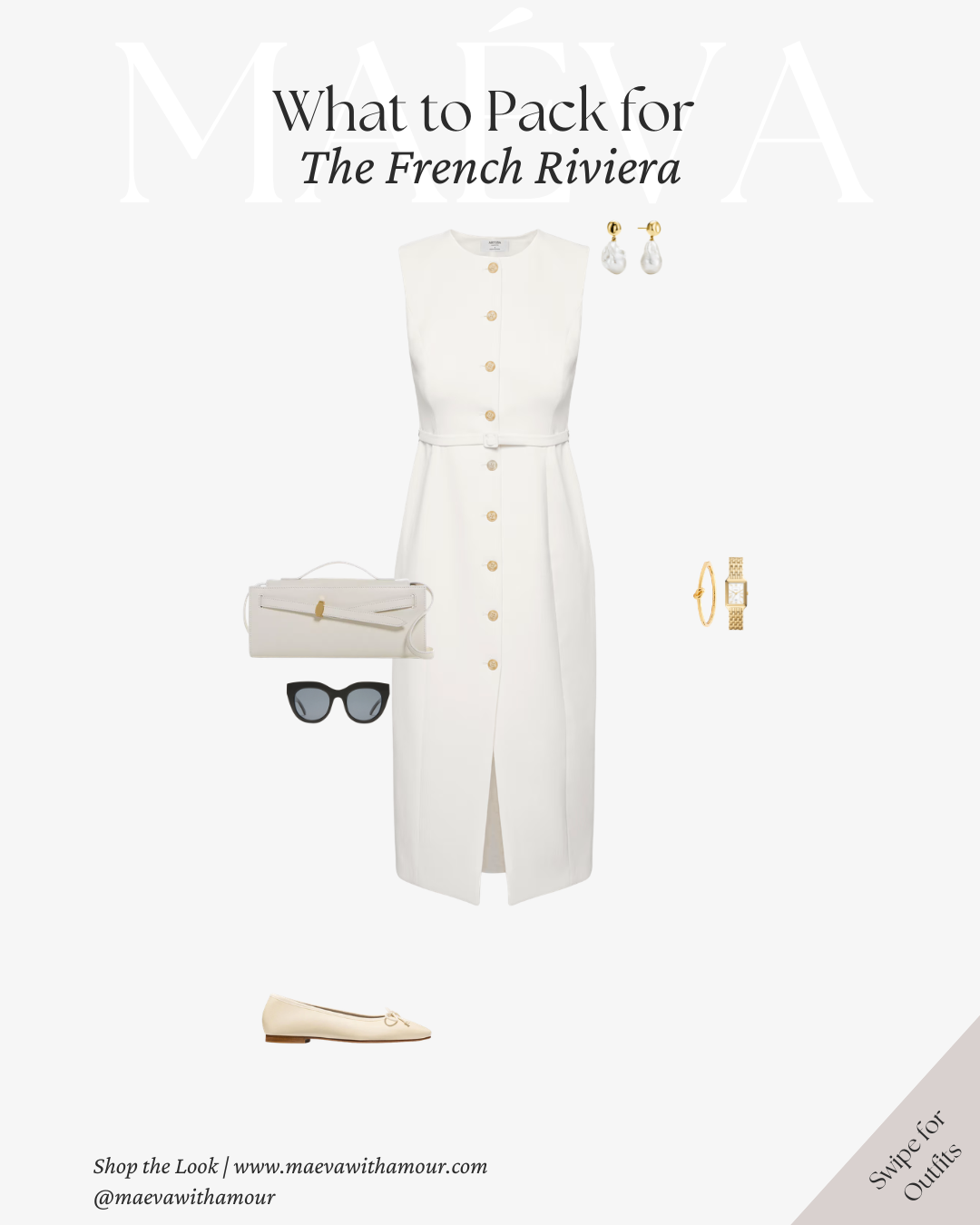 The cream button-front dress styled for daytime creates a soft, refined look that feels effortlessly put together for warm days along the French Riviera. Paired with a structured clutch, ballet flats, and minimal gold jewelry, the outfit feels polished yet easy, perfect for everyday wear.