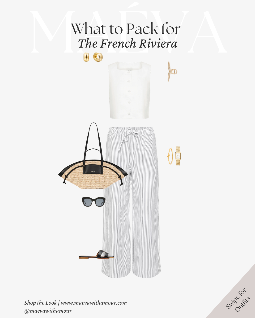 A structured white top paired with relaxed striped trousers creates an easy, balanced look that feels both polished and effortless for warm days along the French Riviera. Styled with a woven basket, minimal gold jewelry, and simple leather sandals, the outfit feels refined while still remaining comfortable and easy to wear.