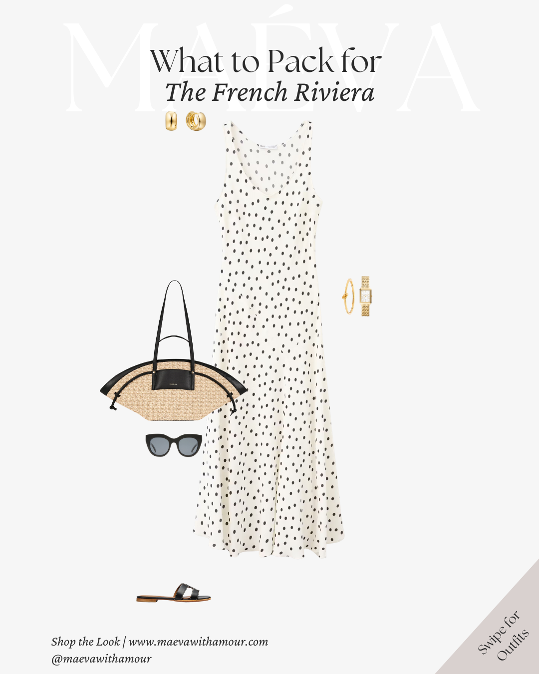 A polka dot midi dress brings a softer, more playful element to the capsule while still maintaining a timeless feel. Paired with a woven basket, minimal gold jewelry, and simple leather sandals, the look feels effortless, feminine, and perfectly suited for warm days along the French Riviera.
