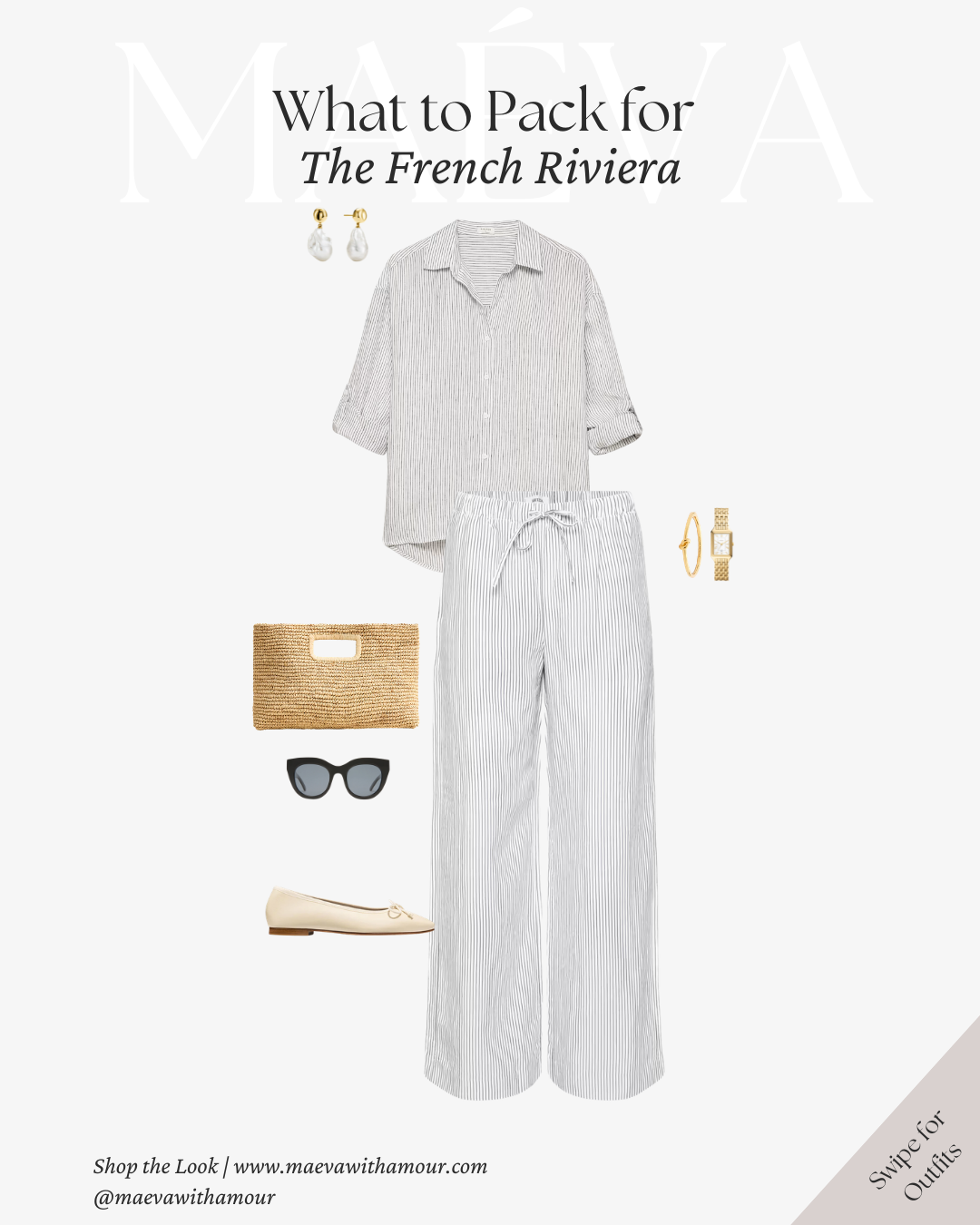 A lightweight striped top and pant set creates an effortless, relaxed look that feels perfectly suited for warm days along the French Riviera. Paired with a woven clutch, soft gold jewelry, and classic cream ballet flats, the outfit feels easy, comfortable, and quietly polished for everyday wear.