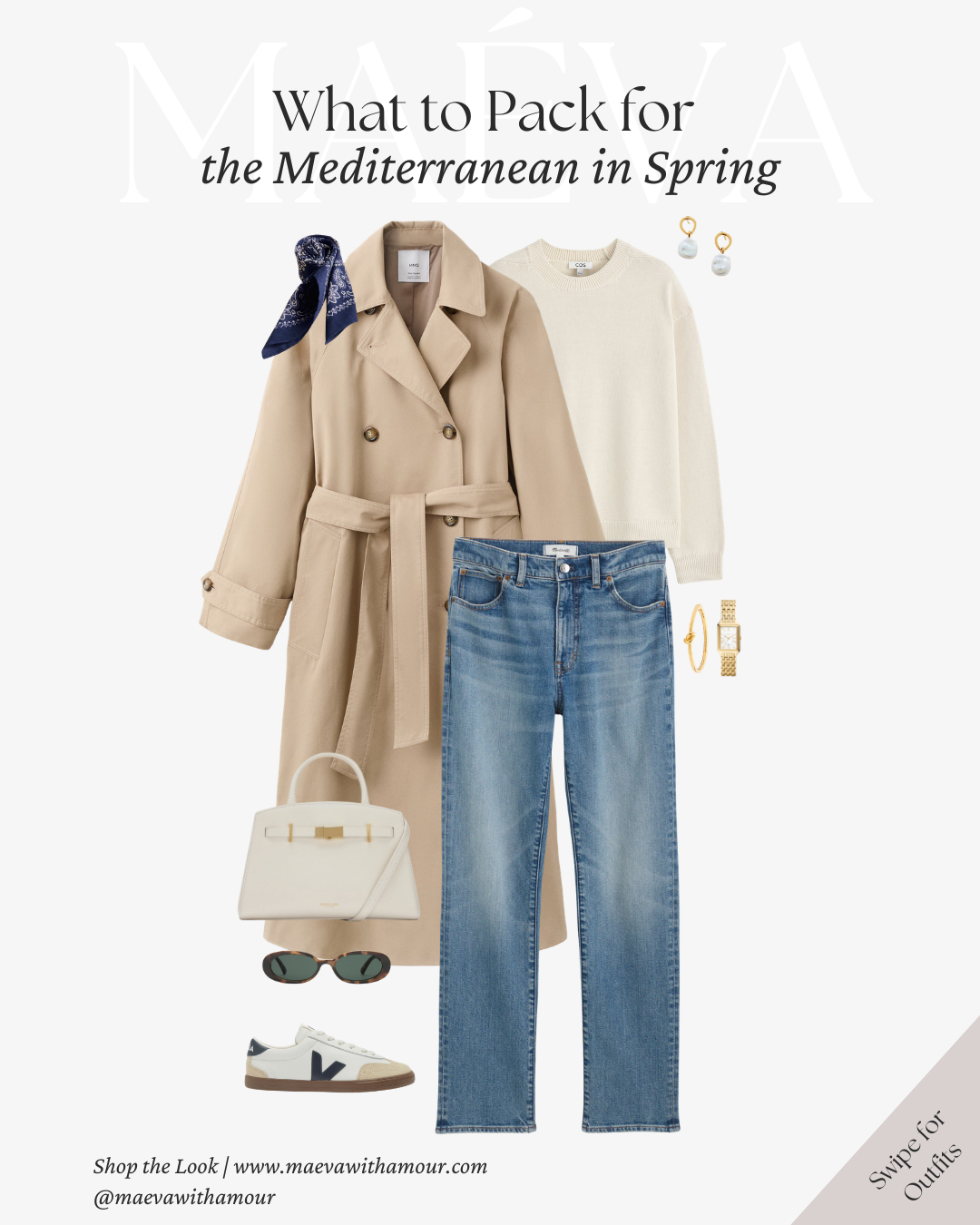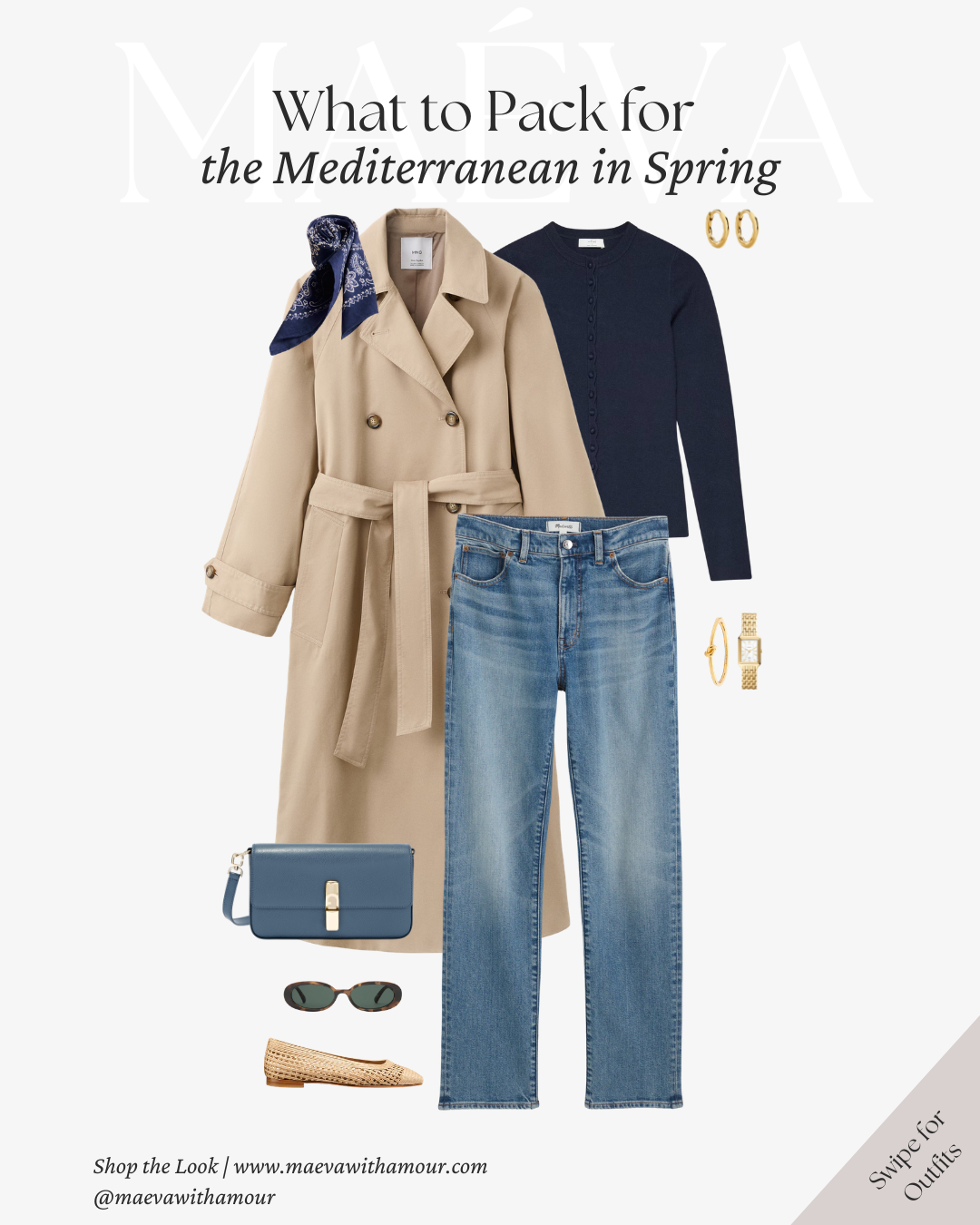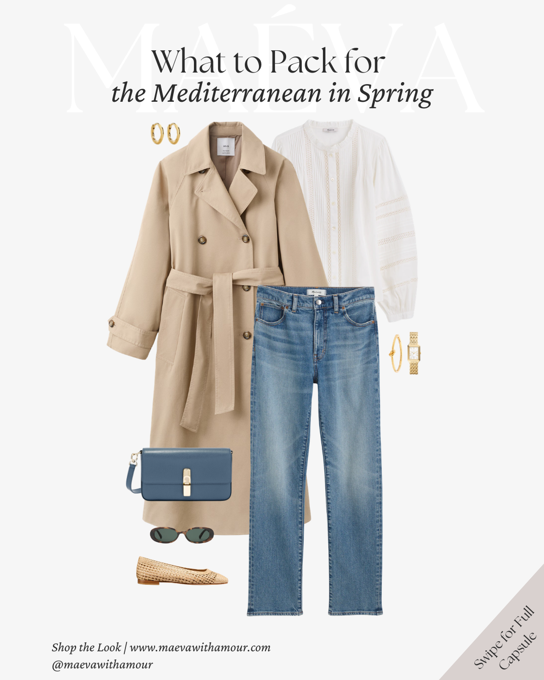 Why It Works: The trench offers lightweight layering for cooler spring mornings, while straight-leg denim keeps the look grounded and versatile. Soft blues combined with warm neutrals reflect the natural palette of the Mediterranean, creating a look that feels cohesive, elegant, and easy to mix and match throughout your trip.
