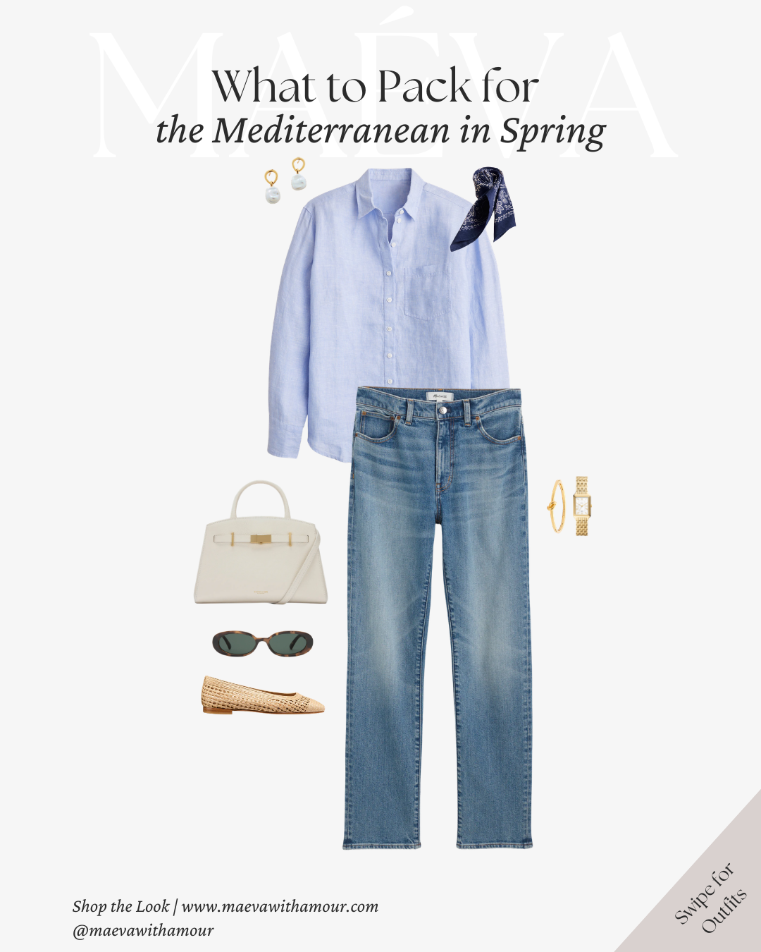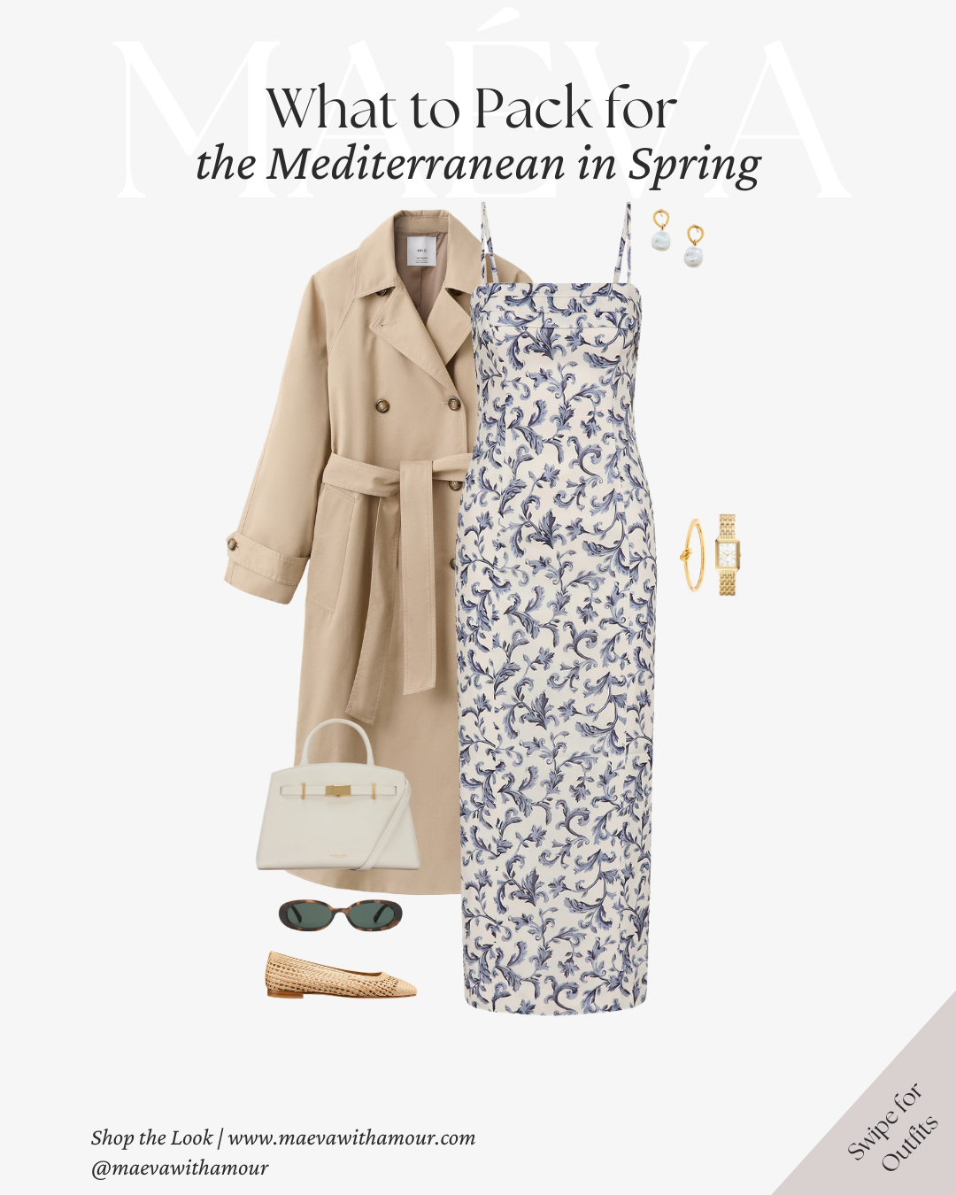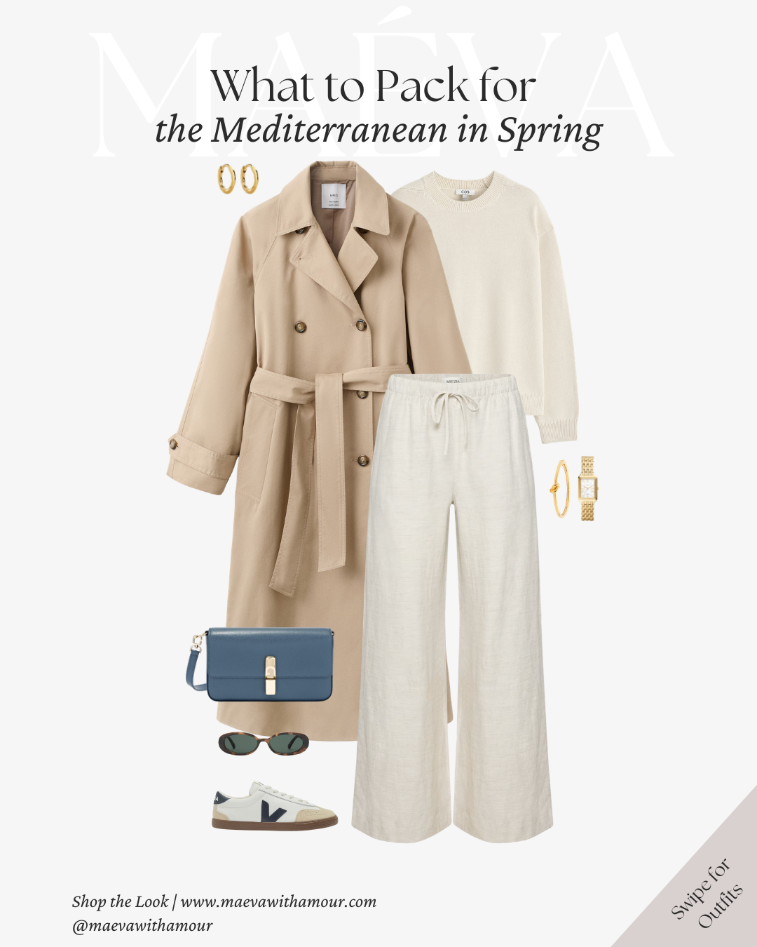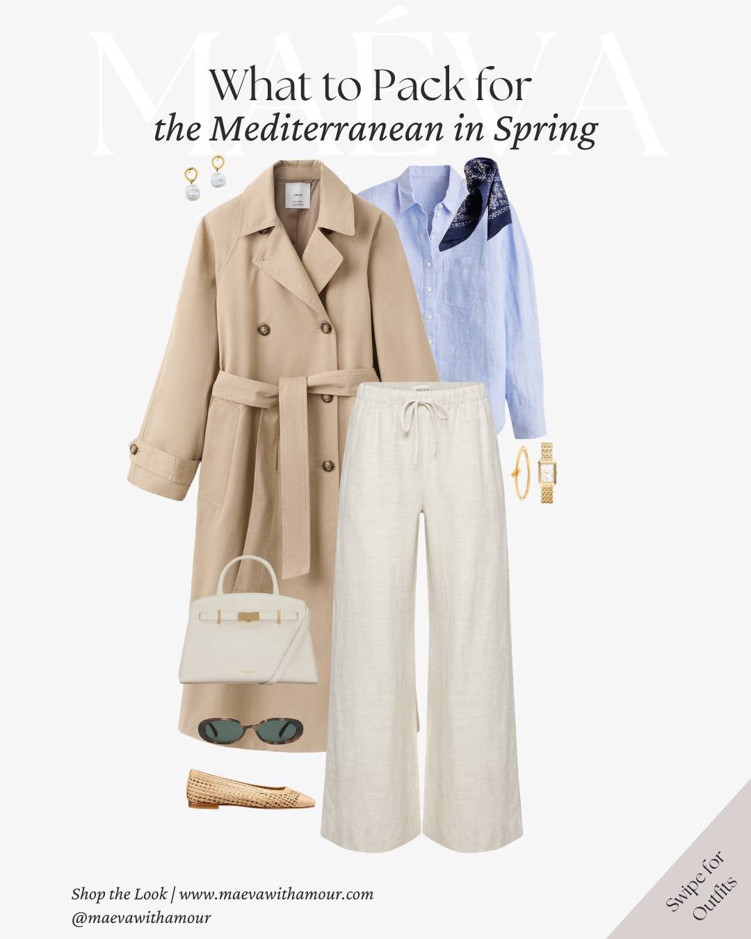 Why It Works: The trench offers lightweight layering for cooler spring mornings, while straight-leg denim keeps the look grounded and versatile. Soft blues combined with warm neutrals reflect the natural palette of the Mediterranean, creating a look that feels cohesive, elegant, and easy to mix and match throughout your trip.