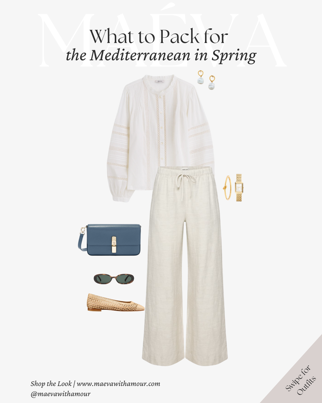 A delicate white blouse paired with relaxed linen trousers creates a look that feels light, feminine, and perfectly suited for the slower rhythm of Mediterranean destinations. The subtle detailing on the blouse adds texture while still remaining understated, allowing the outfit to feel elevated without appearing overly styled. Woven flats, gold jewelry, and a structured blue crossbody bag complete the look, introducing a gentle contrast that ties back to the coastal-inspired palette.