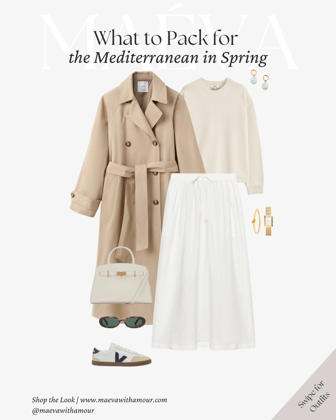 A soft neutral knit paired with a flowing white skirt creates a look that feels both comfortable and refined, offering an easy balance between relaxed and polished. The classic trench adds structure for cooler spring mornings, while sneakers introduce practicality for days that involve more walking. Gold jewelry and a structured cream handbag keep the look feeling timeless and cohesive with the rest of the capsule.