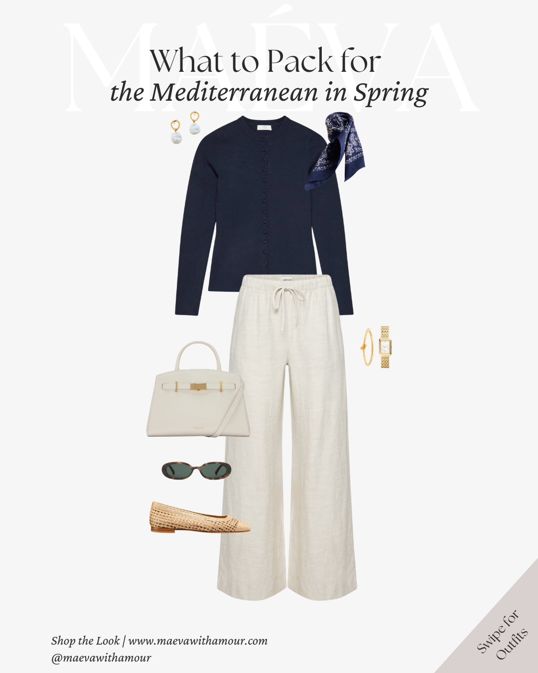 Why It Works: The contrast between the structured cardigan and relaxed linen trousers creates balance, allowing the look to feel effortless without appearing overly casual. The combination of navy, cream, and warm neutral accessories reflects the natural tones often found along the Mediterranean coast, creating a cohesive wardrobe that mixes easily across multiple outfits.