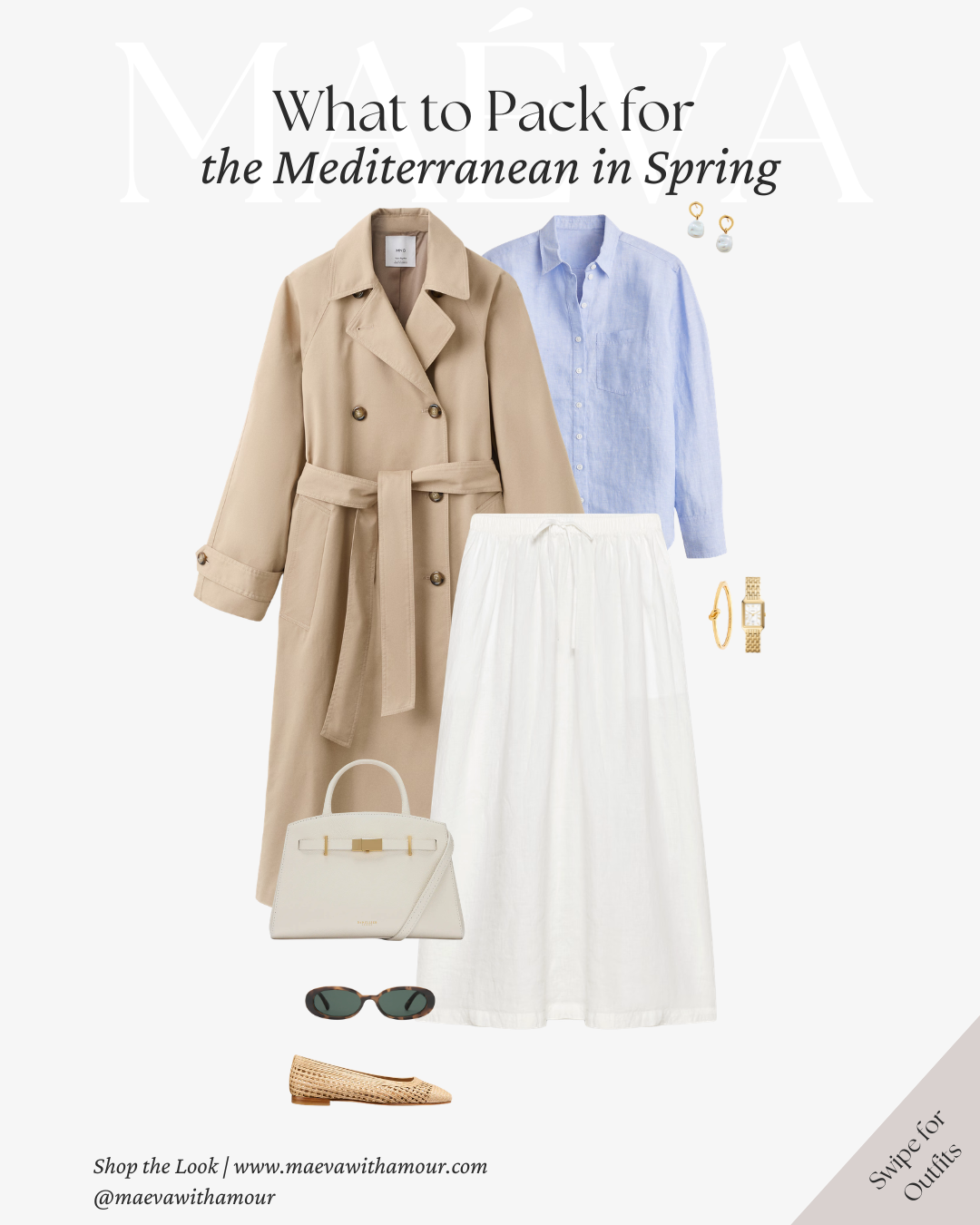 A light blue linen shirt paired with a flowing white skirt creates a look that feels soft, feminine, and perfectly suited to the relaxed elegance of Mediterranean destinations. The airy movement of the skirt adds dimension while remaining comfortable enough for long, leisurely days spent exploring coastal towns or enjoying time outdoors. The classic trench introduces structure for cooler mornings, while woven flats and delicate gold jewelry maintain a timeless, understated feel.