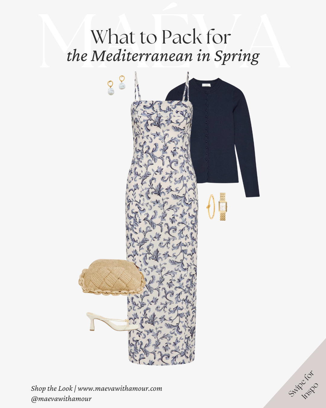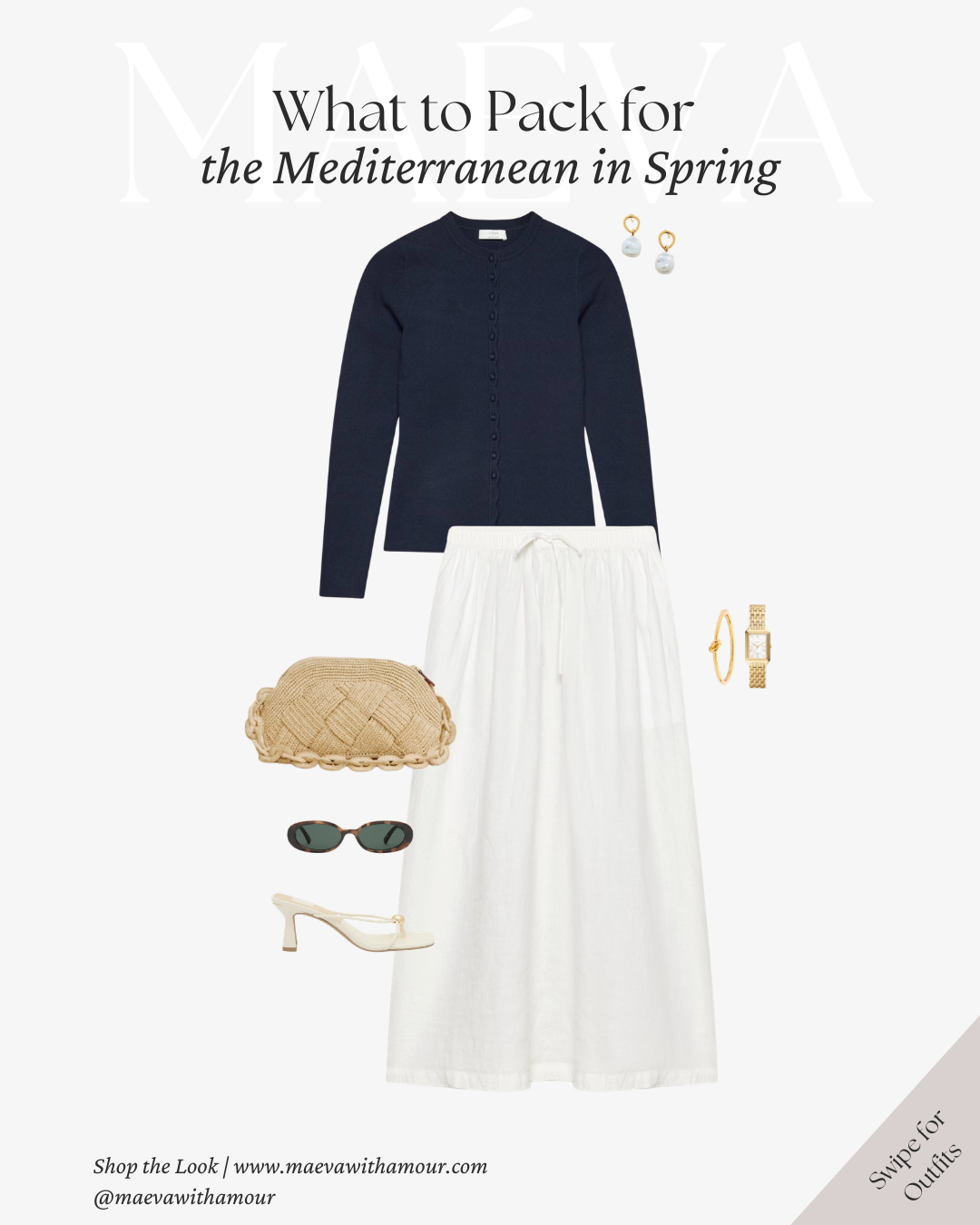 Layering the navy cardigan adds depth and contrast, creating a polished silhouette while providing warmth for cooler evenings near the water. The woven clutch introduces texture that keeps the look connected to the relaxed Mediterranean aesthetic, while delicate gold jewelry adds just the right amount of shine without overpowering the simplicity of the outfit.